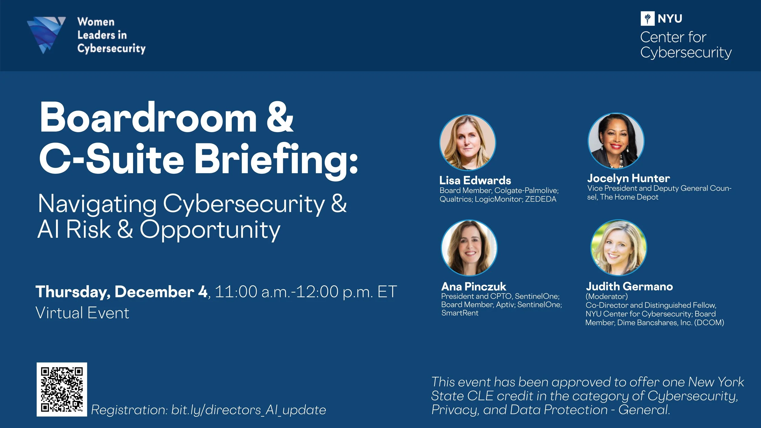 The Women Leaders in Cybersecurity Series convened a virtual panel event on December 4 at 11:00am EST: Boardroom & C-Suite Briefing: Navigating Cybersecurity and AI Risk and Opportunity. Our star-studded panel discussed key issues and insights on what boards, the C-Suite, and their advisors need to know regarding cybersecurity and AI in the boardroom. This insightful conversation spanned topics including: AI-enabled fraud; verifying identities; securing communications; nation-state threats; responsible AI deployment and informed innovation.
